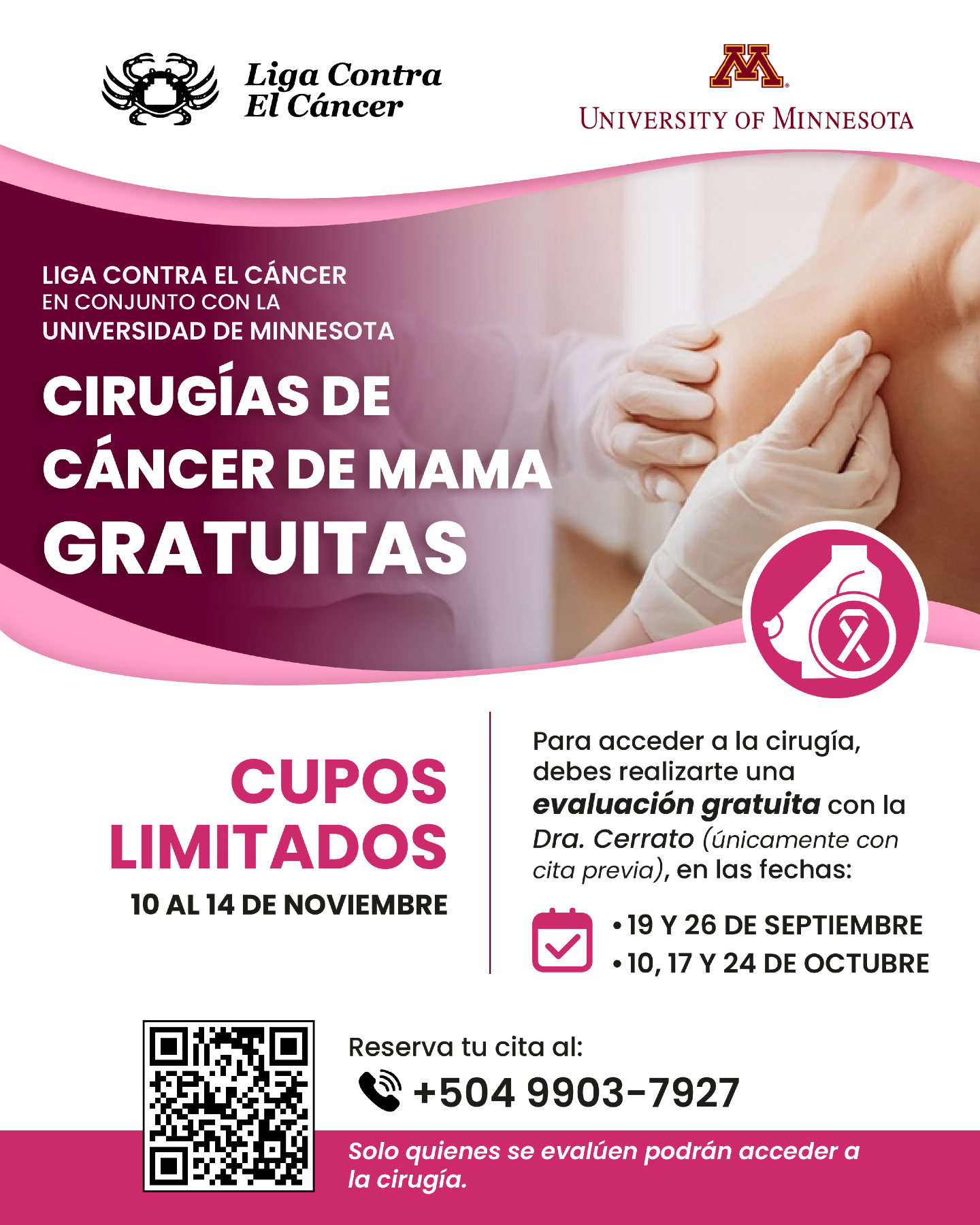 Antes de acceder a la cirugía, las interesadas deberán realizarse una evaluación médica gratuita con la Dra. Cerrato, la cual se llevará a cabo únicamente con cita previa en las siguientes fechas: